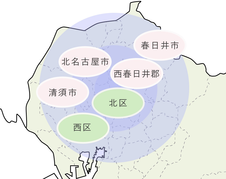 春日井市→西本町、中野町、中新町、二子町、南花長町、花長町、追新町、勝川西町